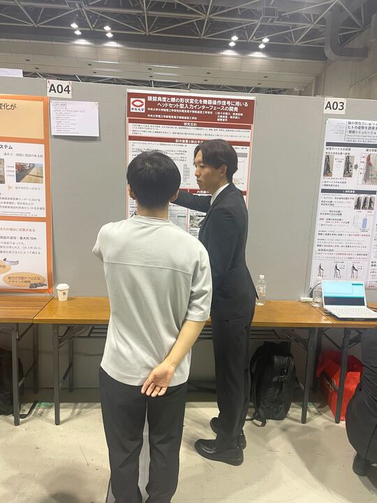 山形市で開催された日本機械学会ロボティクス・メカトロニクス講演会2025 in Yamagataで修士1年の佐々木雅斗さんが「頭部角度と頬の形状変化を機器操作信号に用いるヘッドセット型入力インターフェースの開発」というタイトルで、ポスター発表を行いました。